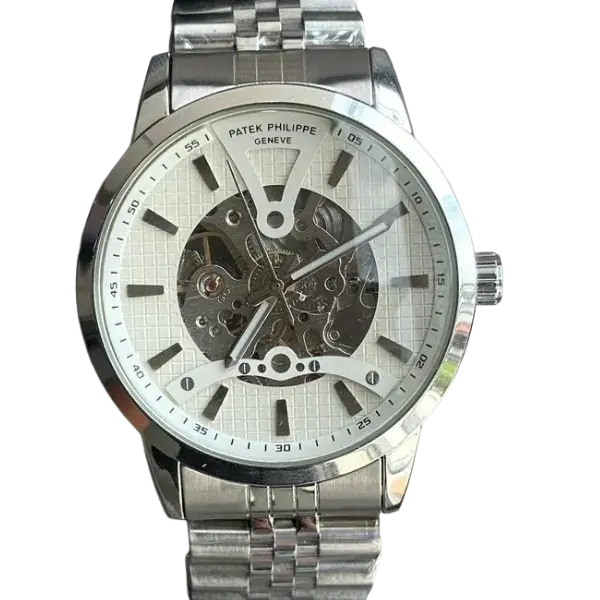 Patek Philippe Crafted with a luxurious gold strap, this watch exudes elegance and sophistication. The silver finish complements the intricate details of the skeleton dial, creating a harmonious balance between opulence and technical mastery. The automatic chronograph function ensures that you not only have a stylish accessory but also a reliable tool for timing events with precision.This is a firstcopy watch
